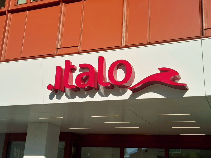 In corrispondenza degli ingressi sono state installate le insegne con il logo Italo: insegne studiate per valorizzare gli accessi e renderli immediatamente riconoscibili.