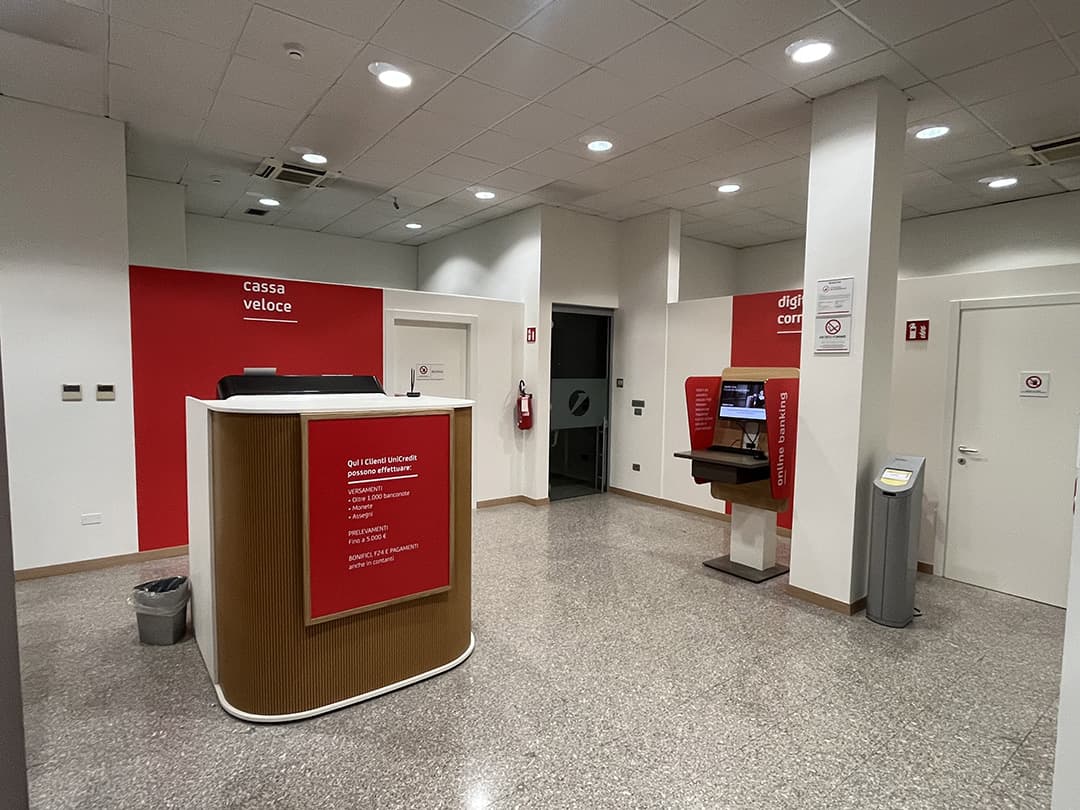 Ci assicuriamo che le filiali da noi realizzate riflettano sempre l’identità visiva di UniCredit, mantenendo un’armonia perfetta tra estetica e funzionalità.